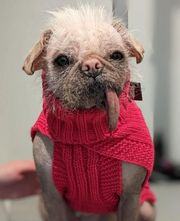 Peggy, born in 2018, is a British dog, icon, and actor known for winning the title of Britain's ugliest dog. Peggy was adopted by Holly Middleton near the end of 2018 when she was six months old, and was given the name Peggy after Holly’s great-grandmother.